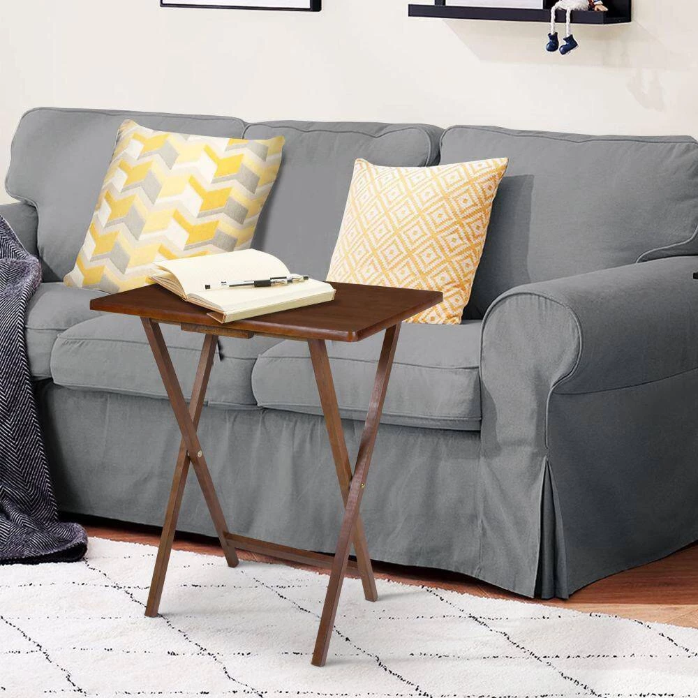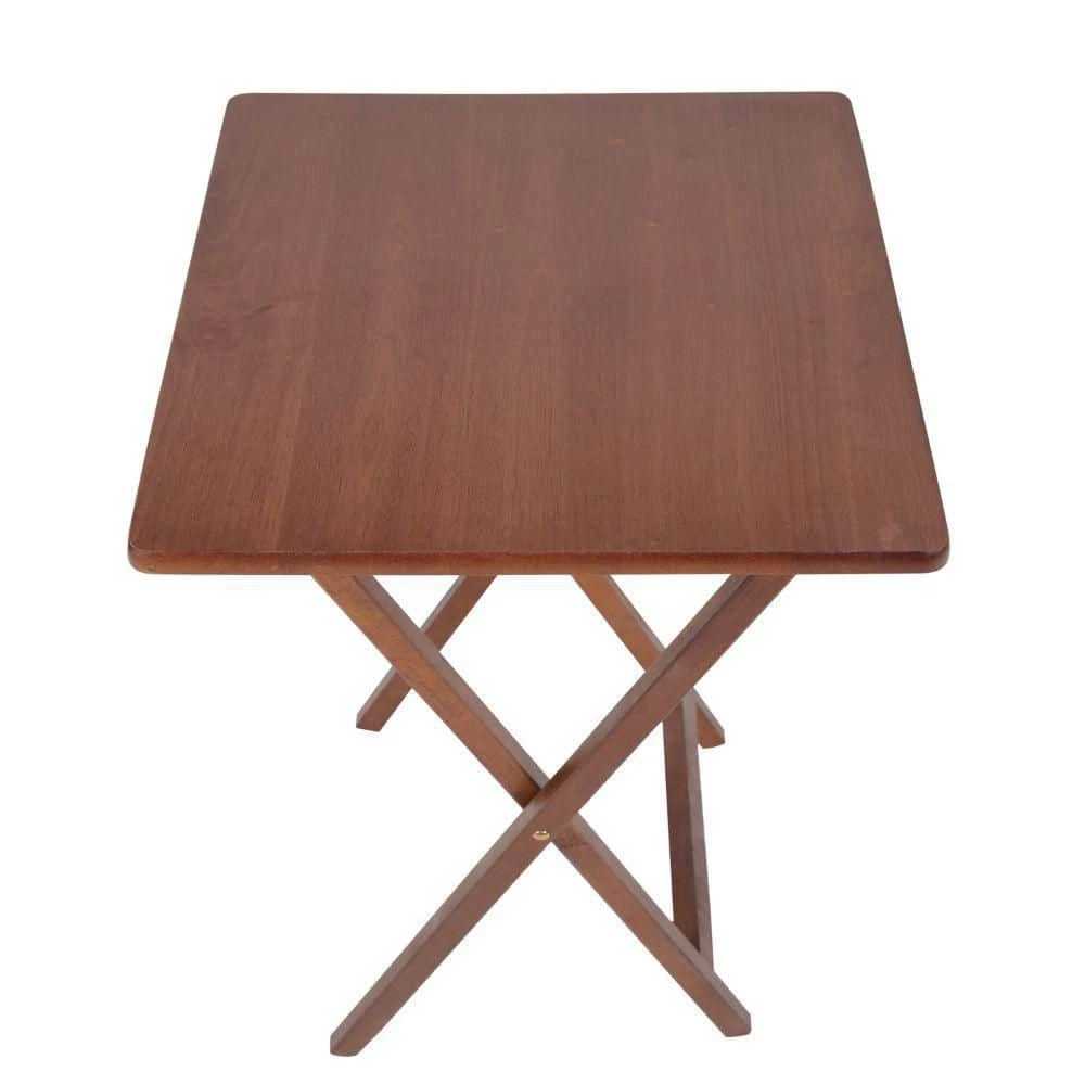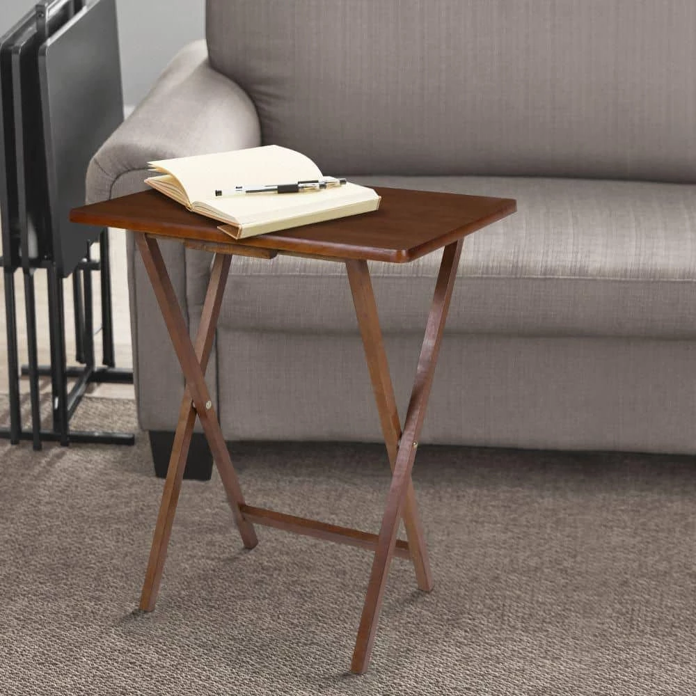 Reinvent your entertainment space decor with this multifunctional walnut brown TV tray side end table from our best selling Coi collection. It features a wide rectangular tabletop that allows you to enjoy a meal and a beverage while watching TV or relaxing in your living room. The folding collapsible X shaped frame allows you to fold it up and keep it aside easily when not in use. Handcrafted from a durable rubberwood frame in warm walnut brown finish, this TV tray makes a perfect fit for your living room, lounge, bedroom, or den. With a clean line silhouette, it blends in with a wide variety of decor styles. Check out our Coi collection for more color options.