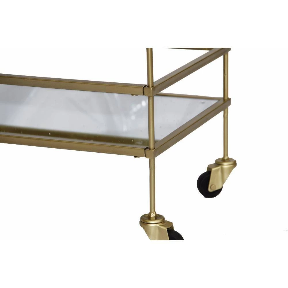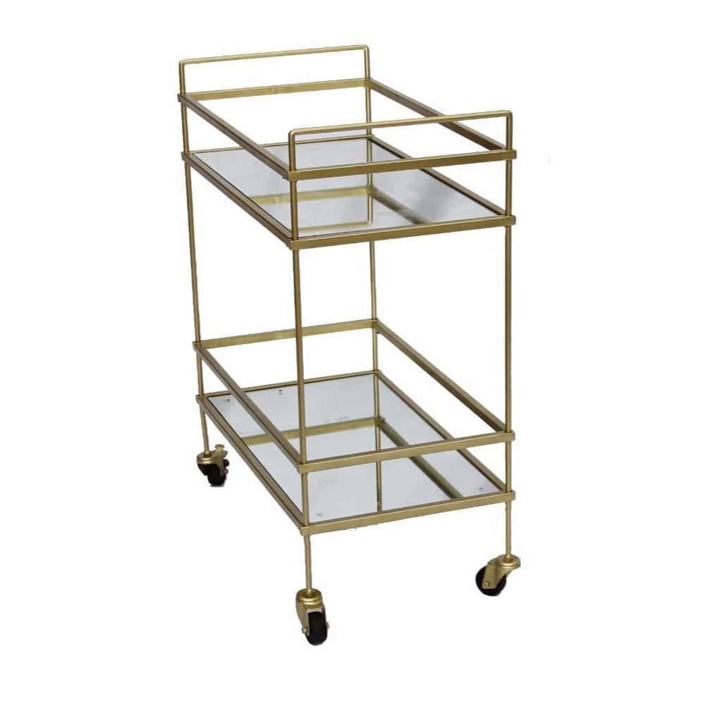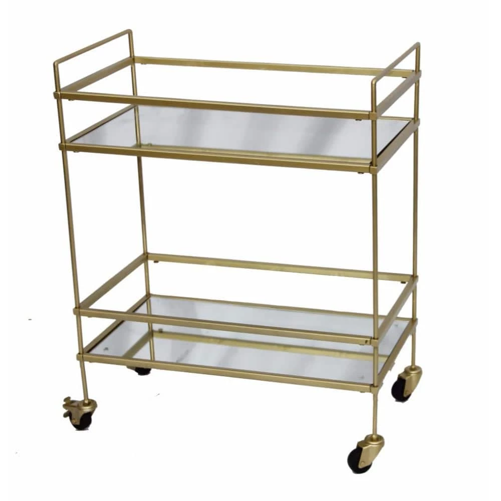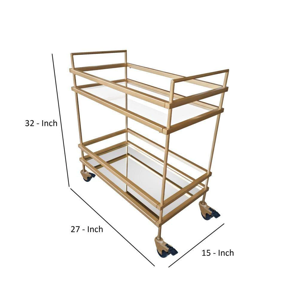 Add this modern efficient bar cart in your living space to make your serving easy while enjoying everything at your reach. The frame of this metal cart is constructed from gold finish iron while the clear mirror shelves accentuate its modern appeal. It features 4 efficient castor wheels that make it move in any direction, out of which 2 comes with a lock. It comes with 2 side handles that offer easy carrying while the rails on each shelf protect anything from falling. The distance between each shelf is spacious enough that you can use it for placing bottles along with other items.