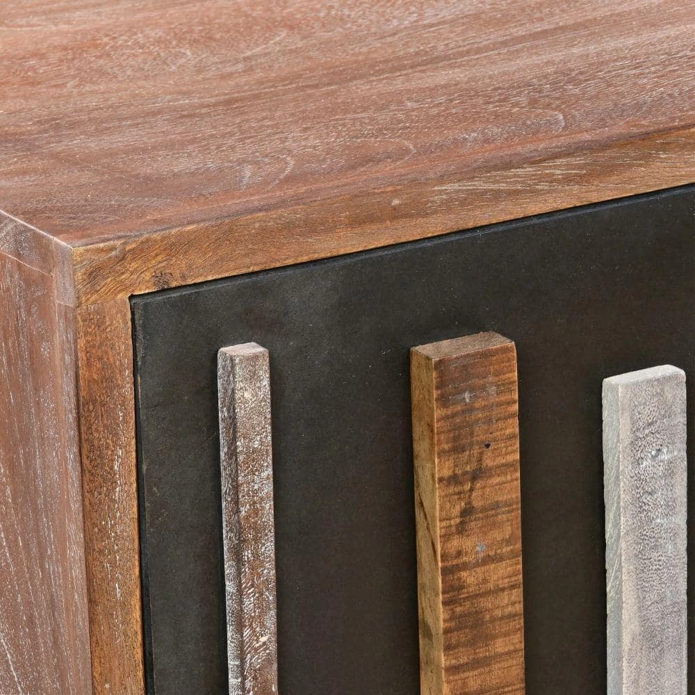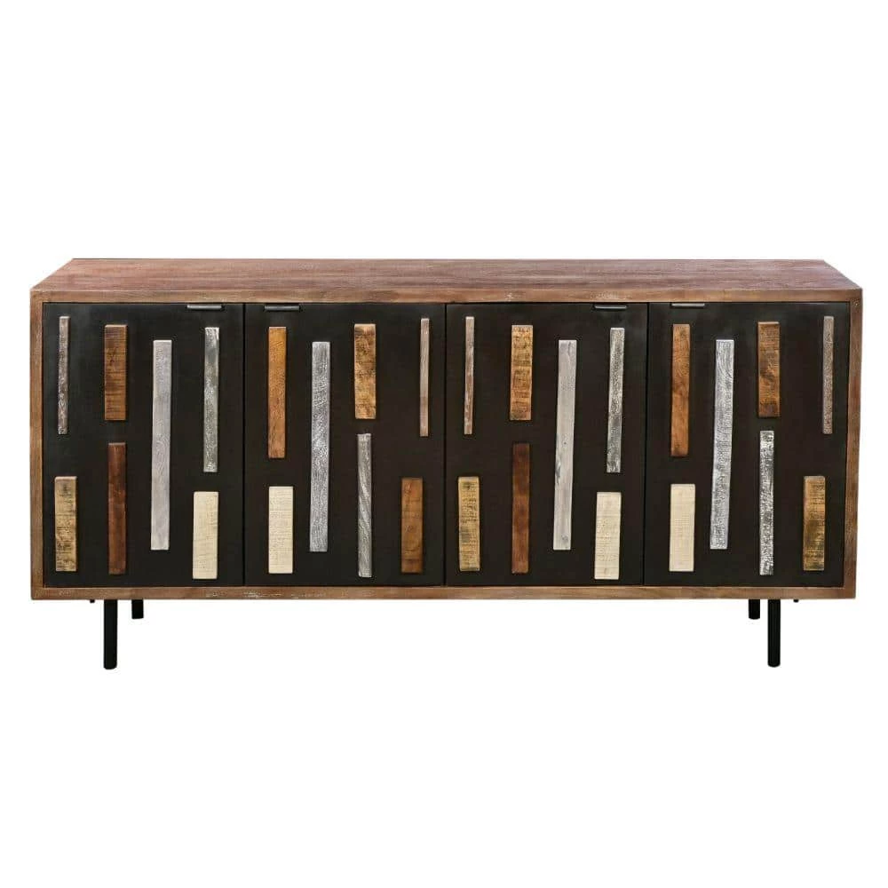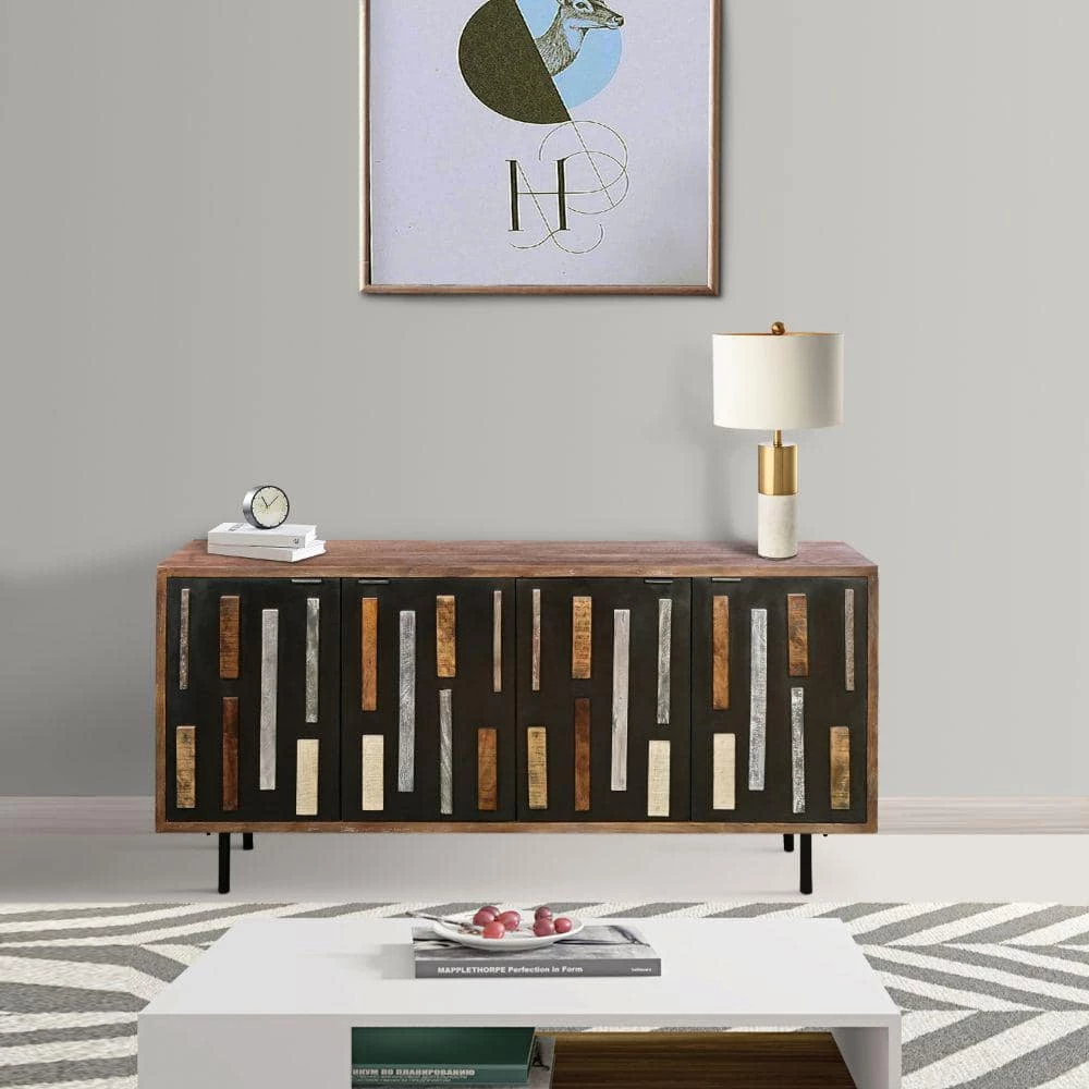 Contemporary in design, this wooden sideboard buffet storage cabinet with doors is the epitome of quality craftsmanship and unique style. Featuring plenty of space with 4-soft closing doors, the multi tone molded trim details grant a riveting edge to its overall look. Handcrafted from the water resistant mango wood and sturdy iron frame for lasting use, the grayish brown tone finish compliments its clean lined appeal. With a wide rectangular top, which offers plenty of space for hand curated decorations, vases, showpieces, and more, it is supported on sturdy tubular legs. Designed with perfection, it can be used to keep your crockeries, table linens, mason jars and other kitchen items organized.
