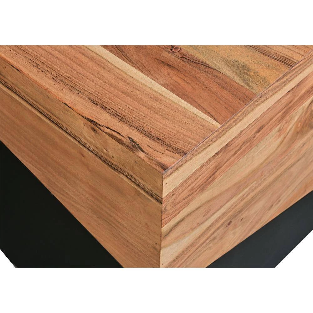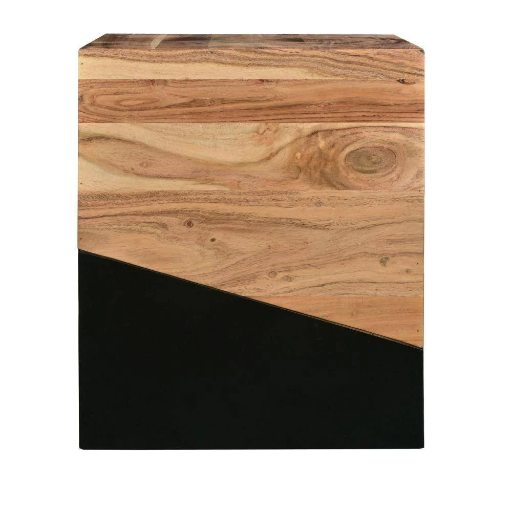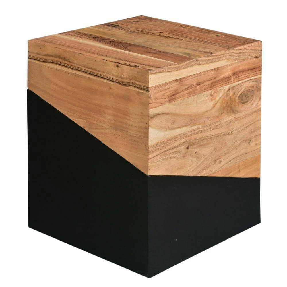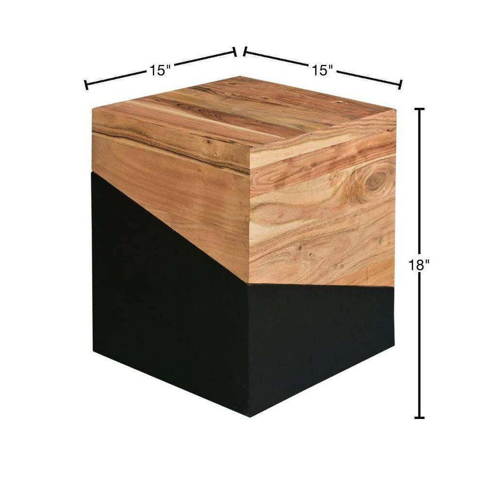 Amalgamate the aesthetics of your interior with the introduction of this geometric theme inspired Wooden End Table. Featuring a cubical shape, it offers a wide square tabletop to flaunt vases, showpieces, valuable collectibles and prized possessions. Constructed sturdily from acacia wood frame for lasting durability, the dual tone finish in the hues of brown and black sets a mesmerizing flair to your interior. The aesthetically pleasing grain details grant a nature inspired appeal to it. Supported on a block base, this striking piece of furniture is sure to add a charismatic flair to your place. Combining the essence of clean lined design and exquisite craftsmanship, it readily blends in with a variety of decor settings.