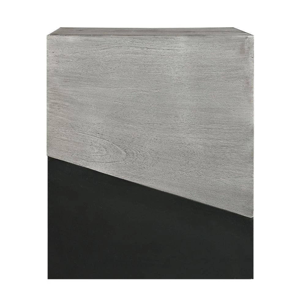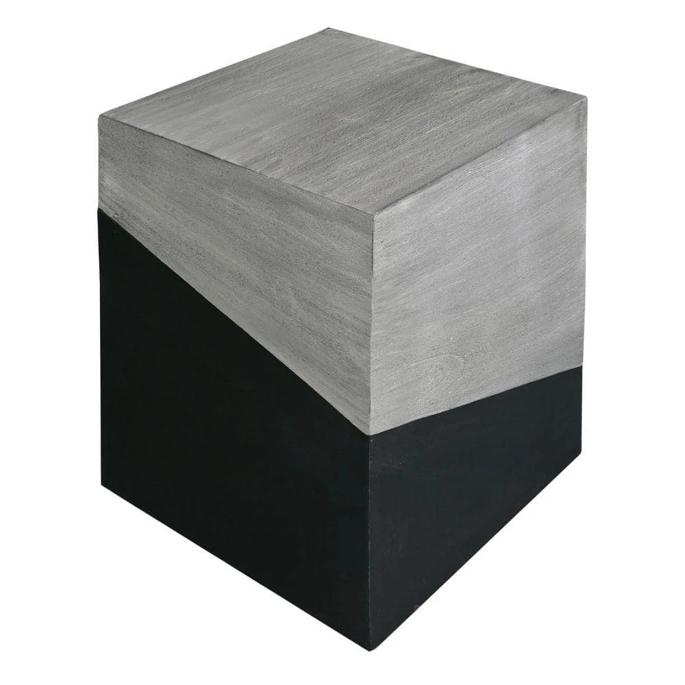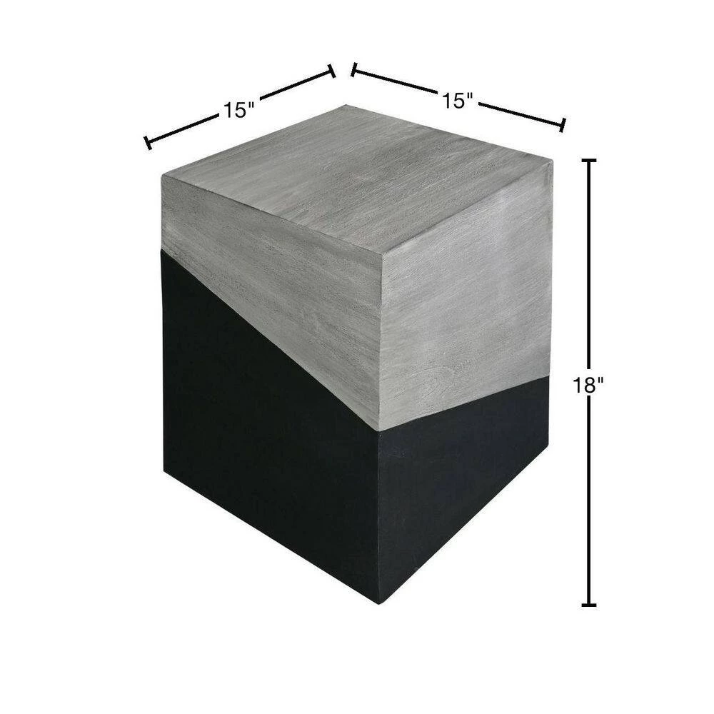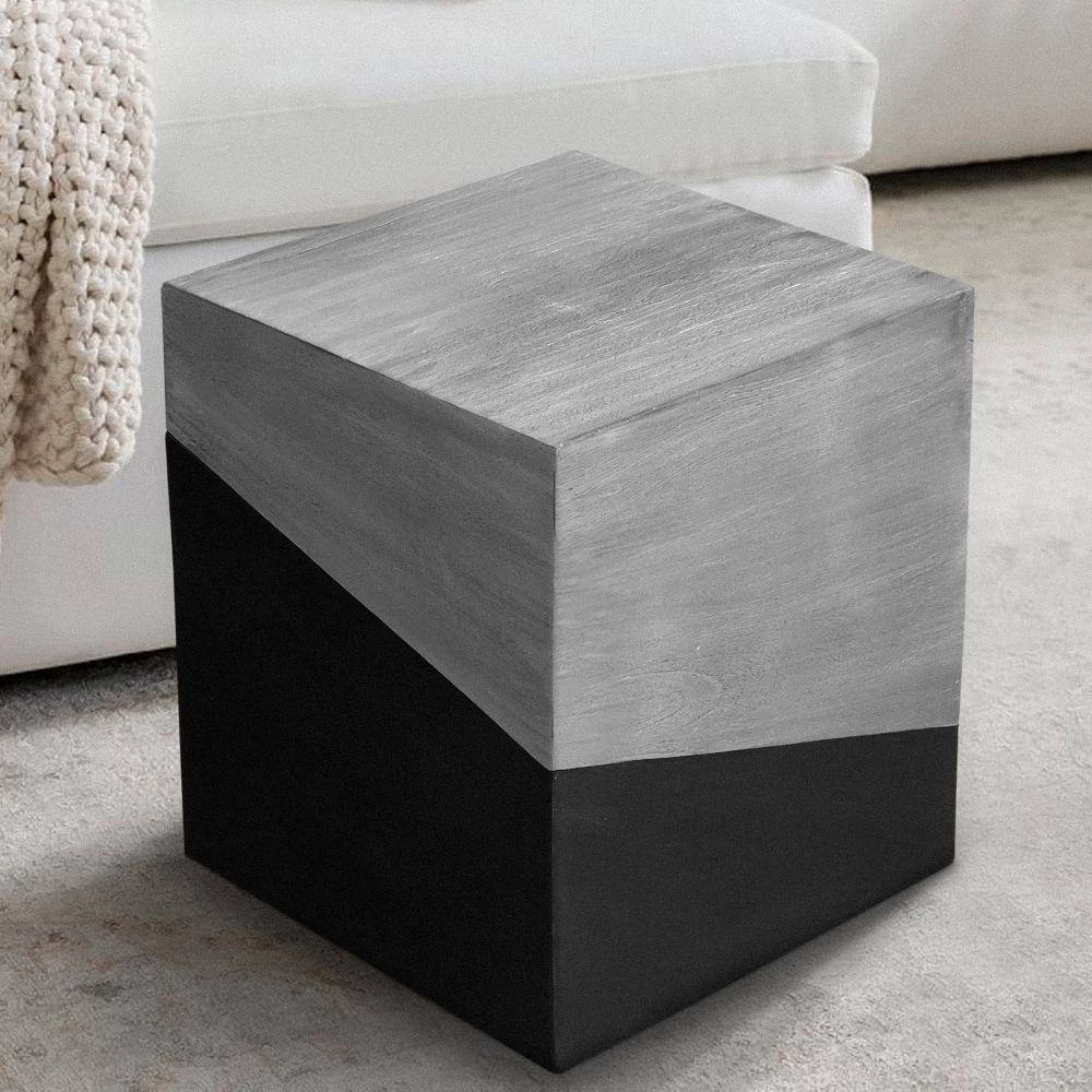 Amalgamate the aesthetics of your interior with the introduction of this geometric theme inspired Wooden End Table. Featuring a cubical shape, it offers a wide square tabletop to flaunt vases, showpieces, valuable collectibles and prized possessions. Constructed sturdily from mango wood frame for lasting durability, the dual tone finish in the hues of gray and black sets a mesmerizing flair to your interior. The aesthetically pleasing grain details grant a nature inspired appeal to it. Supported on a block base, this striking piece of furniture is sure to add a charismatic flair to your place. Combining the essence of clean lined design and exquisite craftsmanship, it readily blends in with a variety of decor settings.