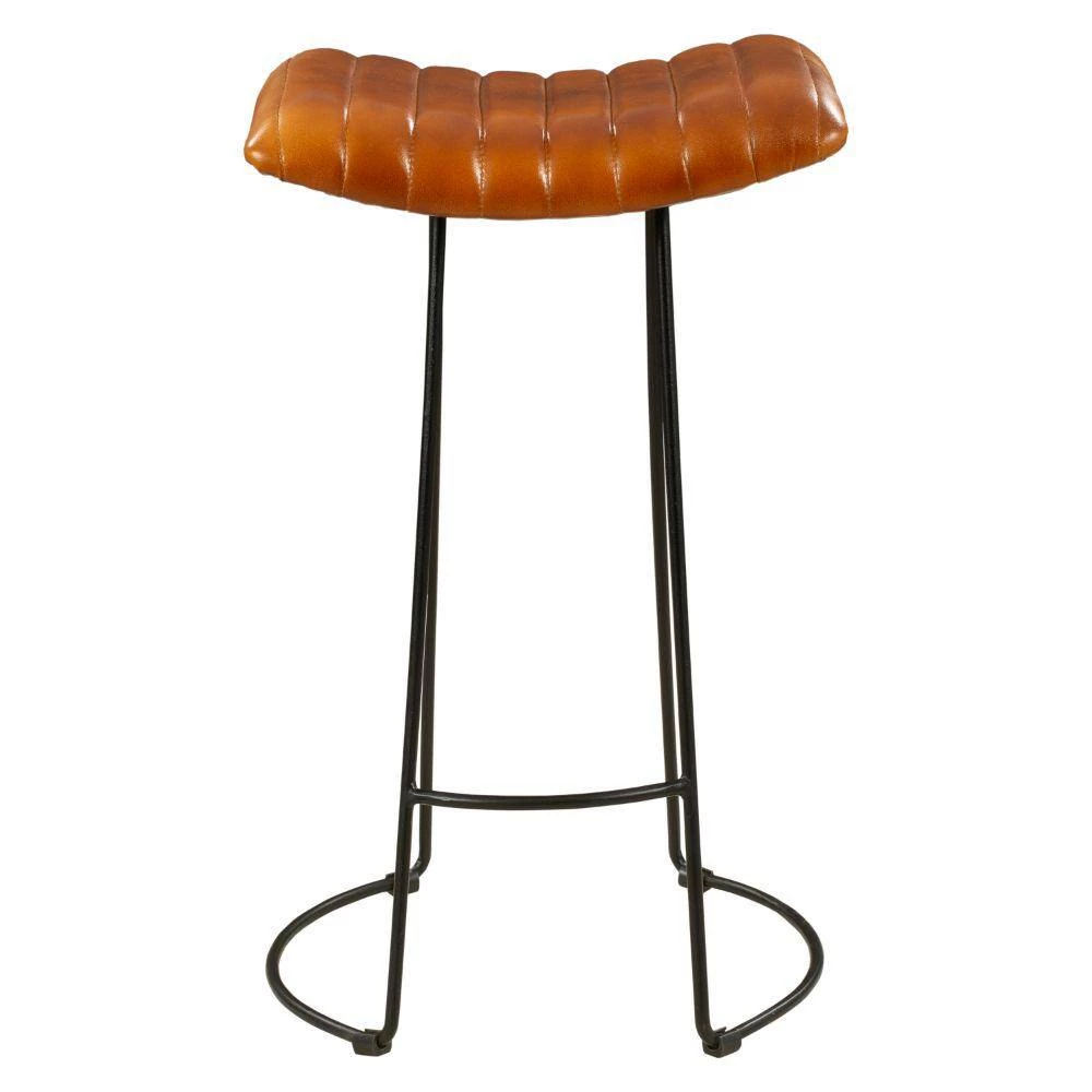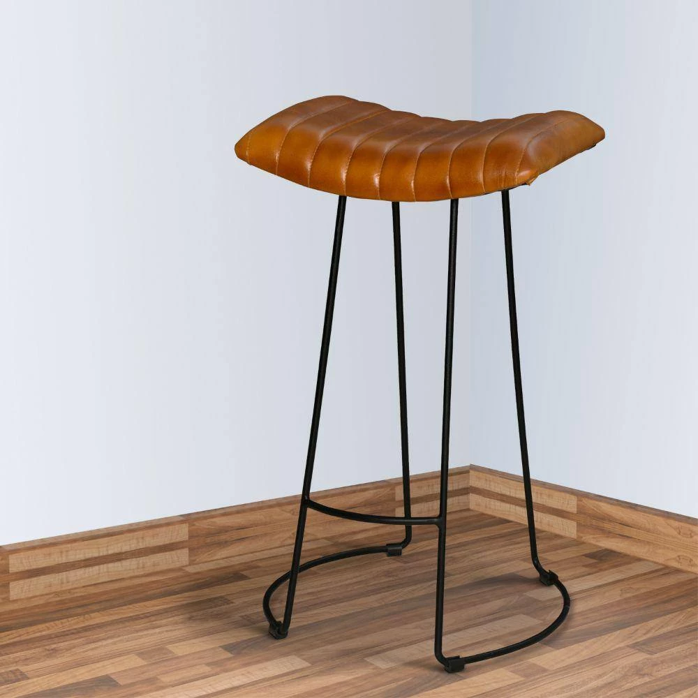 Sophistication meets industrial style with this exquisitely designed Wooden Barstool. Featuring a curved padded seat for utmost comfort and channel-tufted details for visual flair, it is supported on tubular legs with a uniquely designed curved base. Handcrafted from an iron frame for lasting durability, the tan brown tone genuine leather upholstery accentuates the black powder-coated frame. Bolstered with a stretcher that doubles as footrest, this sleek frame Barstool is sure to add a riveting flair to the aesthetics of any kind of interior. Apart from offering a sophisticated seating in the bar space, it can also be used in counter top dining.