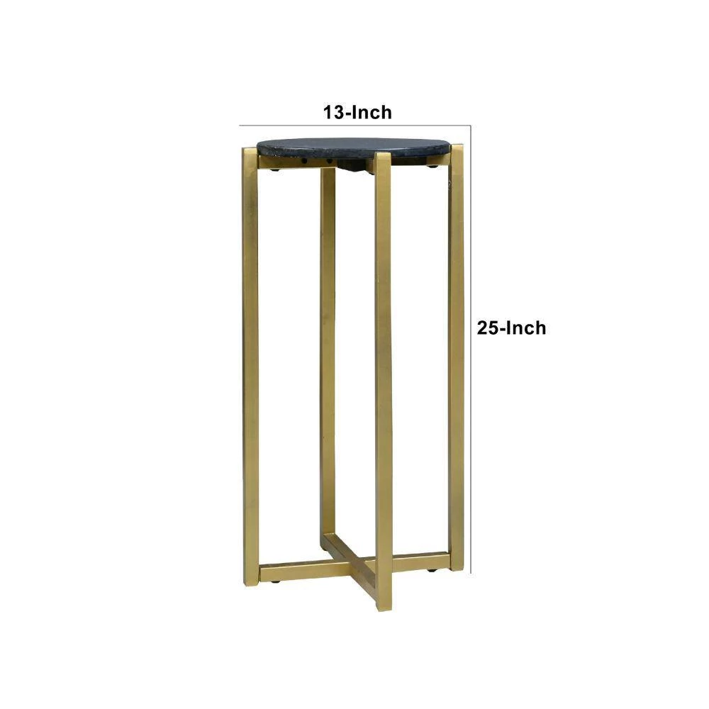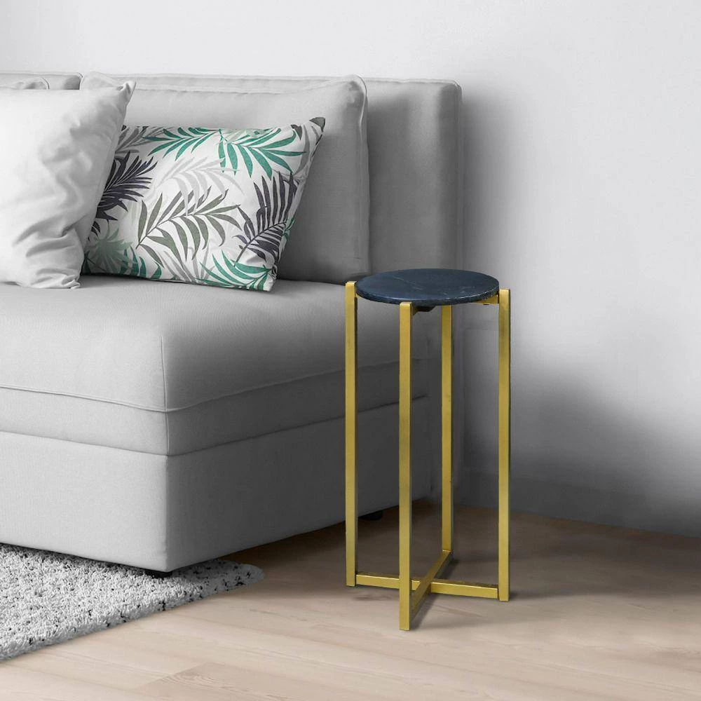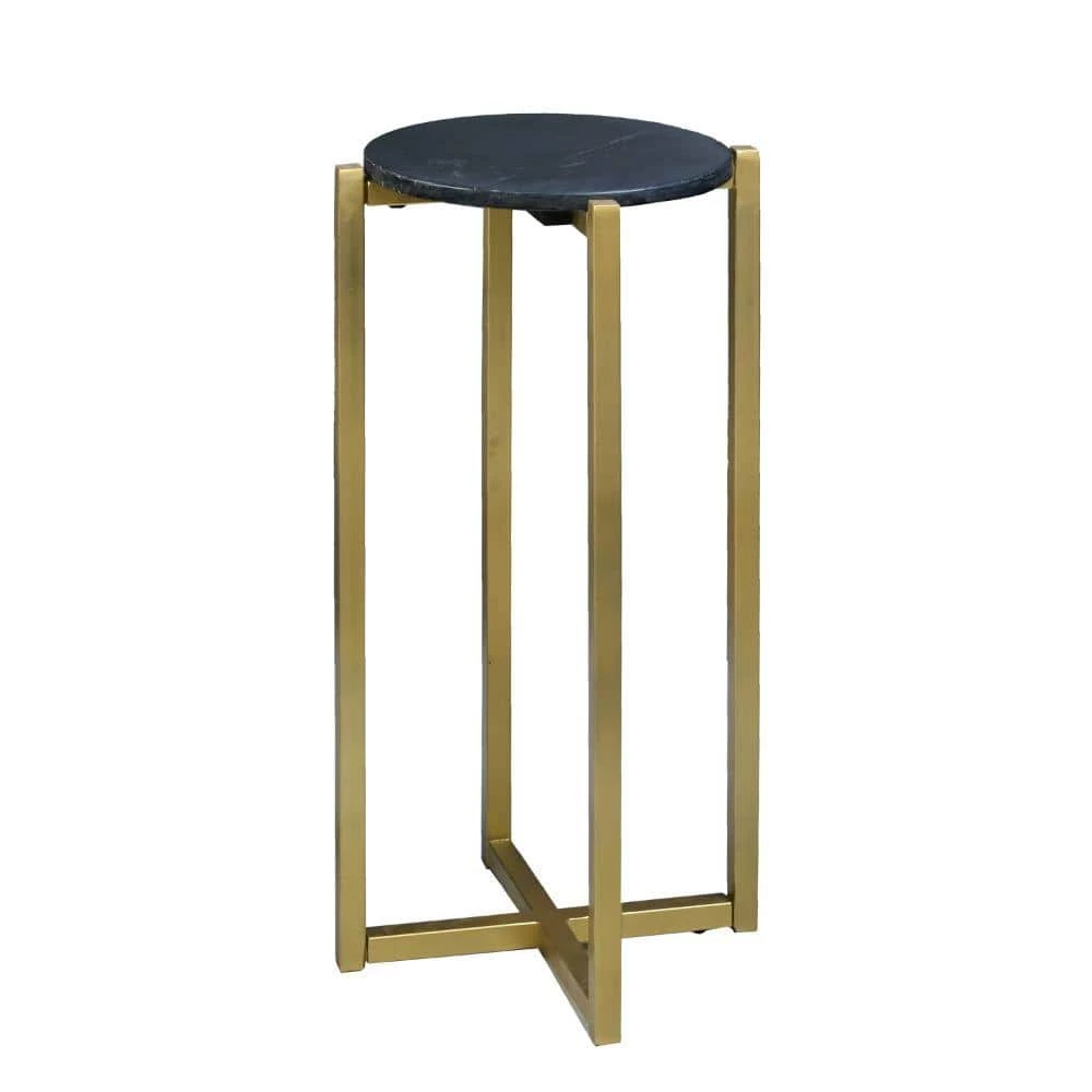 Simplicity, class, and a touch of luxury come together with this modern side table from our premier Ivy collection. With a round silhouette and a black marble accented top, the piece is supported on a durable, lightweight metal frame with an X-shape crossed design at the base. This streamlined design makes it a versatile piece that’s ideal in smaller spaces, whether in a sitting area or next to a bed. This gorgeous side table is handcrafted with an expert level of attention to detail and makes for a luxurious addition to your living room, foyer, den or bedroom. The black marble top harmonizes with the gold tone knock down iron frame, and floor protectors at the base prevent scratches and abrasions on hard flooring. Whether you use this piece as an accent table to showcase potted plants, a lamp, or photos, or as a side or end table while lounging on your favorite couch or chair to keep keys, remotes, electronics and handy essentials. This piece will be an elegant companion and a welcome style statement in your home for years to come.