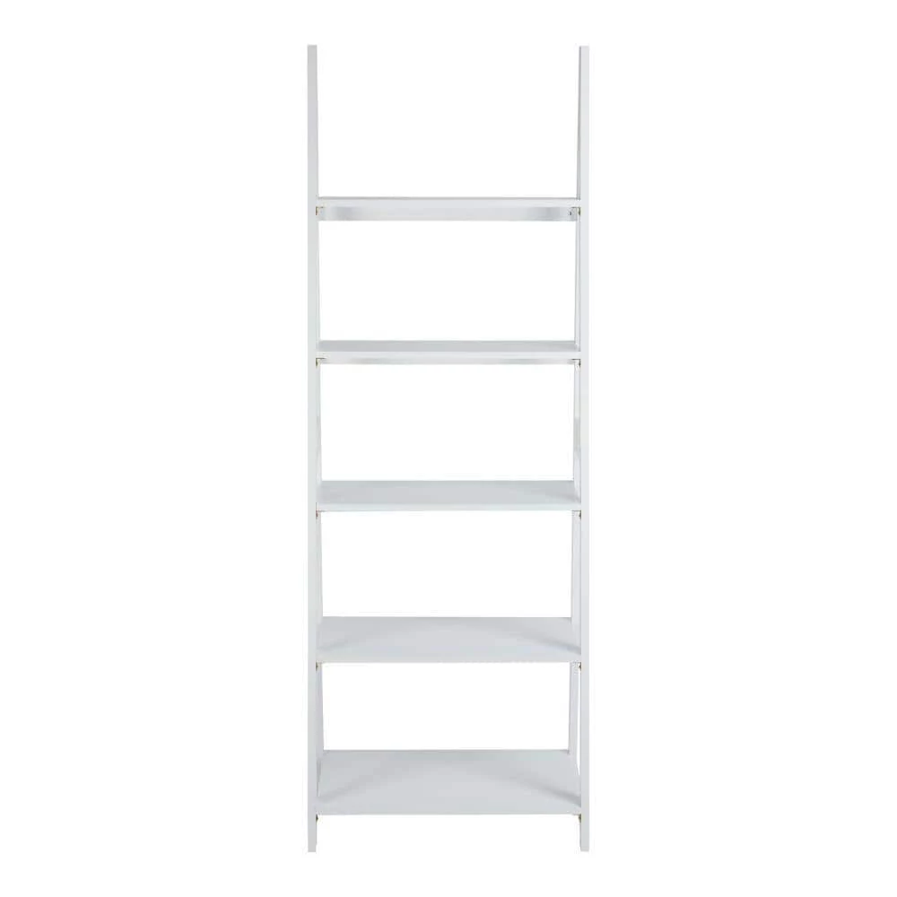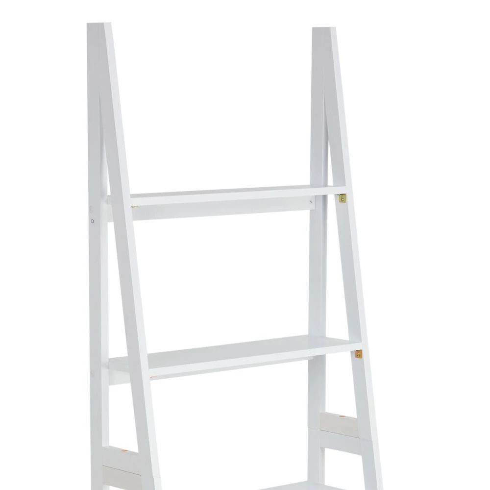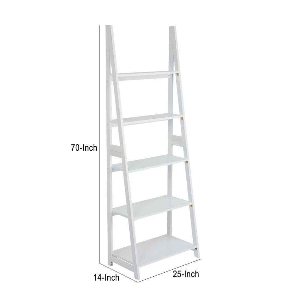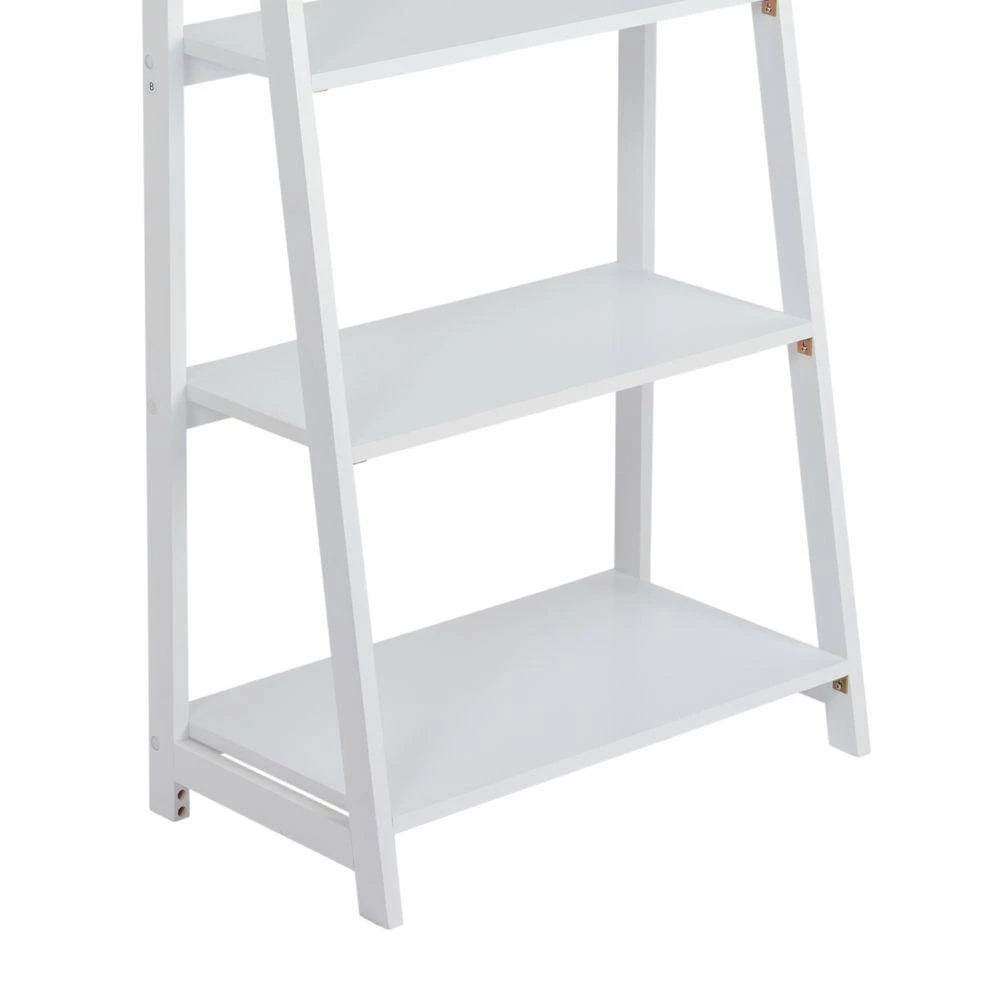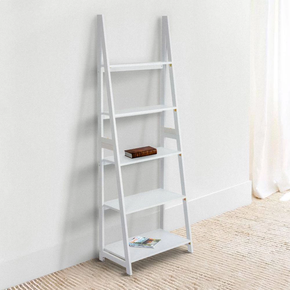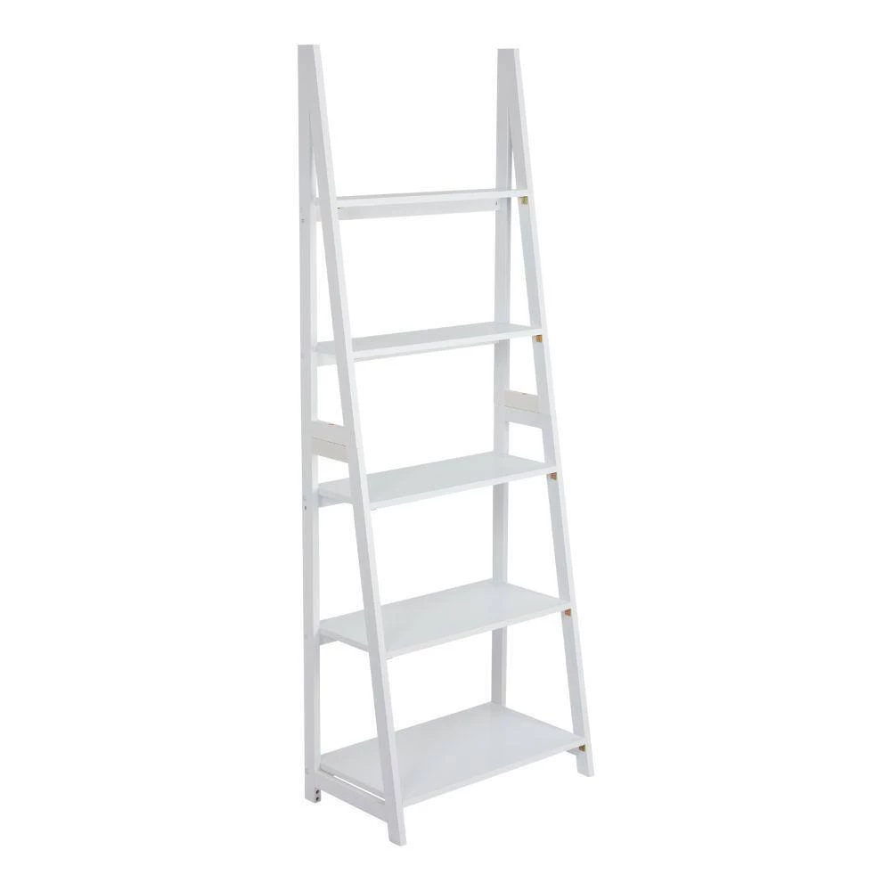 With a clean lined minimalistic silhouette, this ladder bookshelf from our best selling Iza collection makes a perfect fit for your living room, den, office, or study. It features a five tier shelving unit to keep your books organized or showcase your hand curated decorations, vases, showpieces and more. Handcrafted from a durable rubberwood frame with composite wood shelves, it is accented in a brilliant white tone, emanating a coastal yet Scandinavian aesthetic. With a sleek A shaped frame, this bookshelf goes perfectly well with a wide variety of decor styles. Check out our Iza collection for a small bookshelf in black finish.
