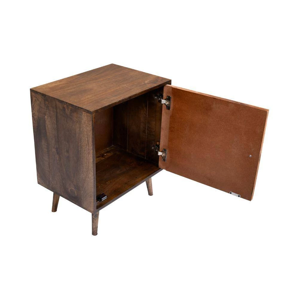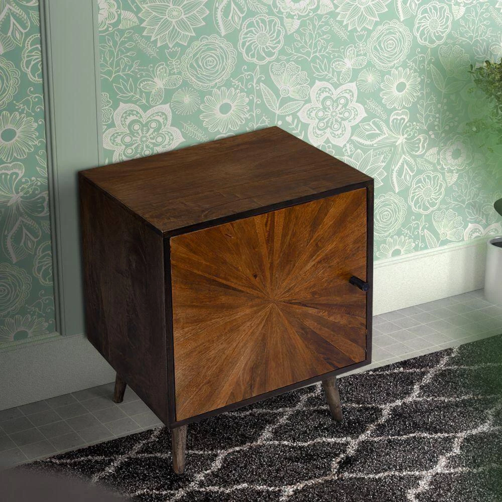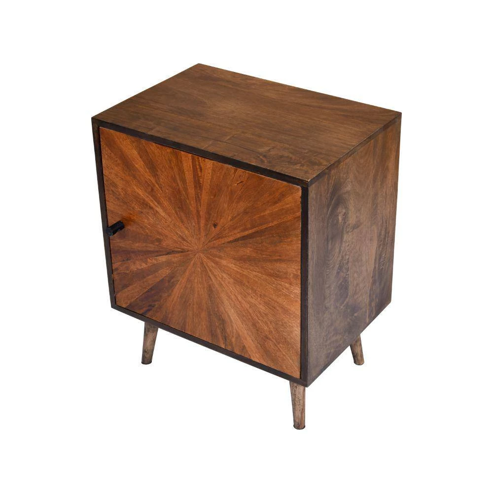 Upgrade your indoor furnishings with this mid century modern nightstand. Featuring a sturdy construction of warm brown mango wood which showcases an appealing sunburst design on the cabinet door that adds depth to the overall design. It comes with one cabinet door that offers ample display and storage space for your handy bedside essentials. Supported on angled legs for added style and stability, it is an ideal addition for a quick update to any existing setting such as contemporary, industrial, modern, transitional, or Scandanvian. Check out our Jag collection for matching products.