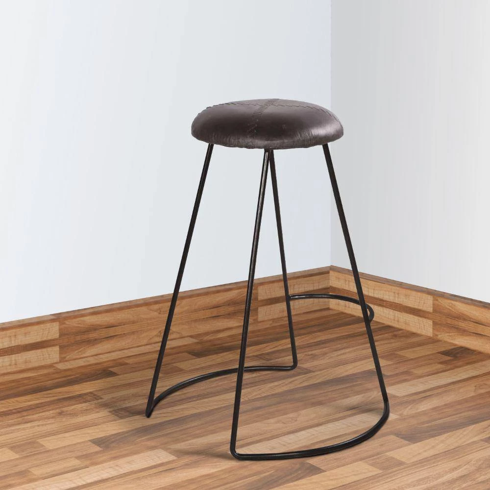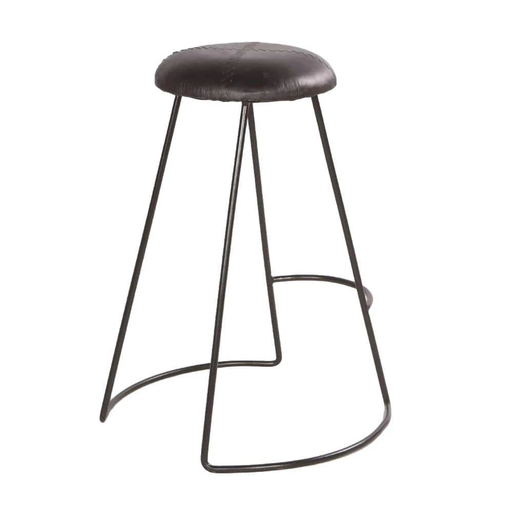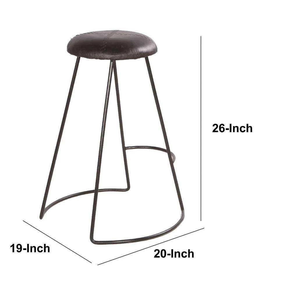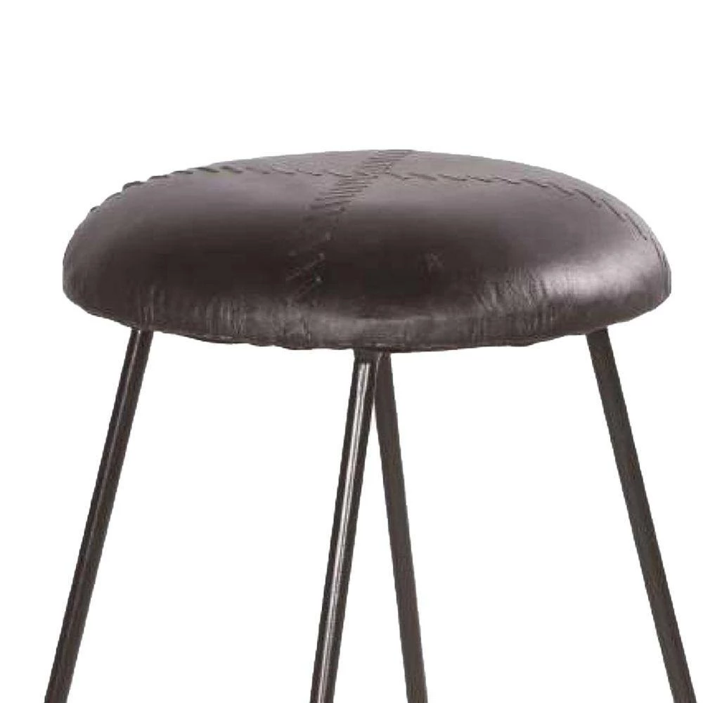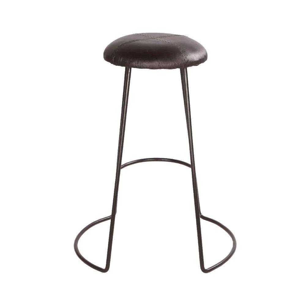 Stylish, comfortable, and currently trending, this modern counter height stool makes a perfect fit for your interior decor. Featuring a round padded seat, the elegant baseball stitching imparts a unique character to the stool. Handcrafted from a lightweight yet sturdy iron frame in a black finish, it is upholstered in matching genuine leather. A perfect fit for your counter height dining table or kitchen countertop, it is supported on a flared sled style base with a stretcher that doubles as a footrest. This appealing stool is sure to revamp your interior decor.