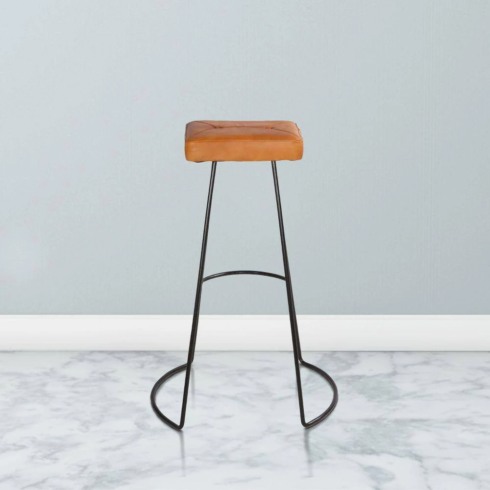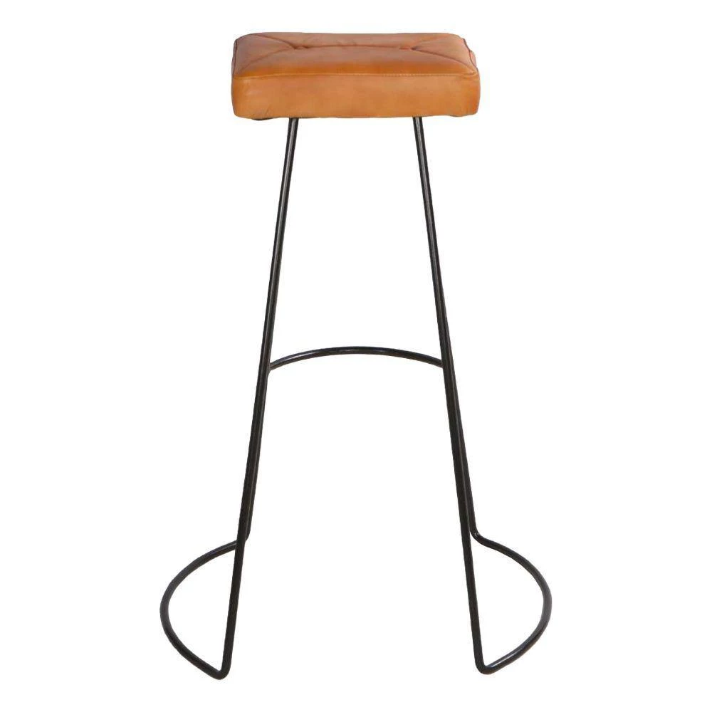 Reinvent your bar space decor with this expertly crafted barstool. Featuring a foam-encased padded seat with button-tufted details, it is handcrafted from a lightweight yet sturdy iron frame in a black finish. Upholstered in a clean tan brown genuine leather, the stool is supported on a flared sled-style base. With a curved stretcher that doubles as a footrest for additional comfort, this barstool makes a perfect fit for your bar height dining table or bar countertop. This contemporary style barstool goes perfectly well with a wide variety of decor styles whether it is industrial, transitional, modern, or Scandivanian.