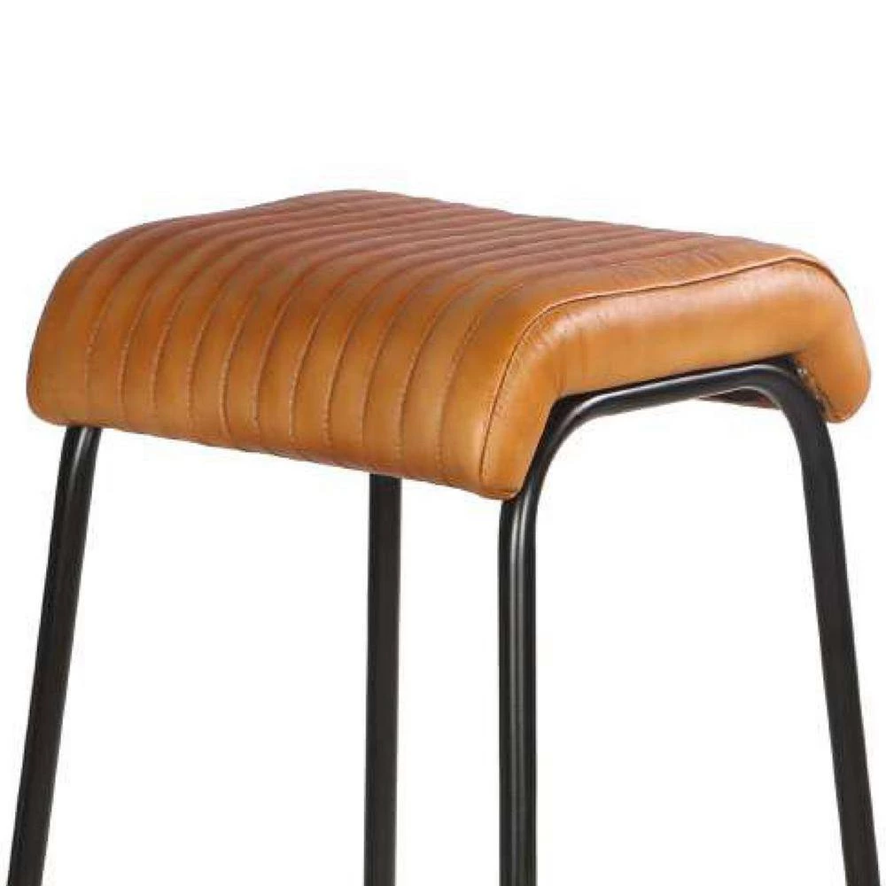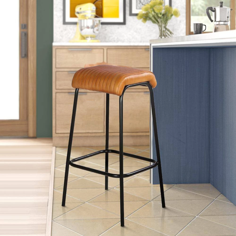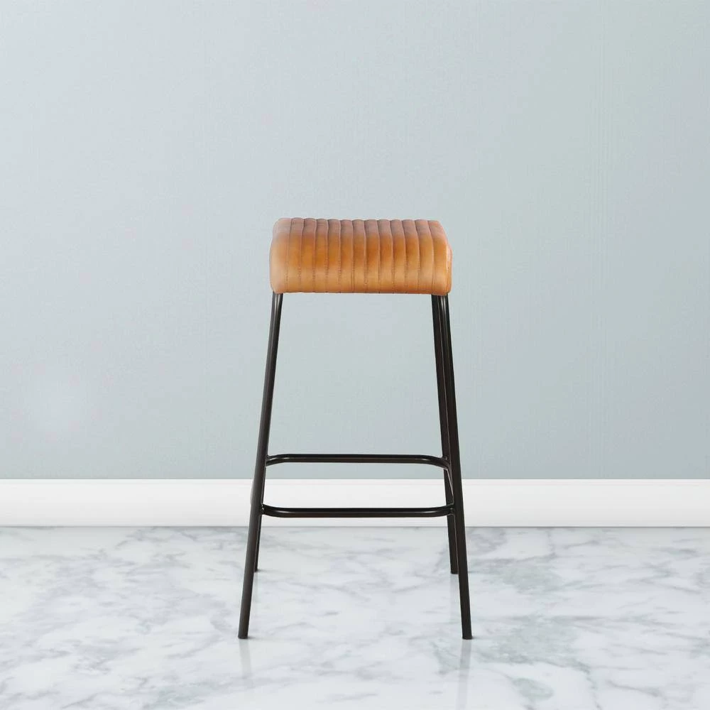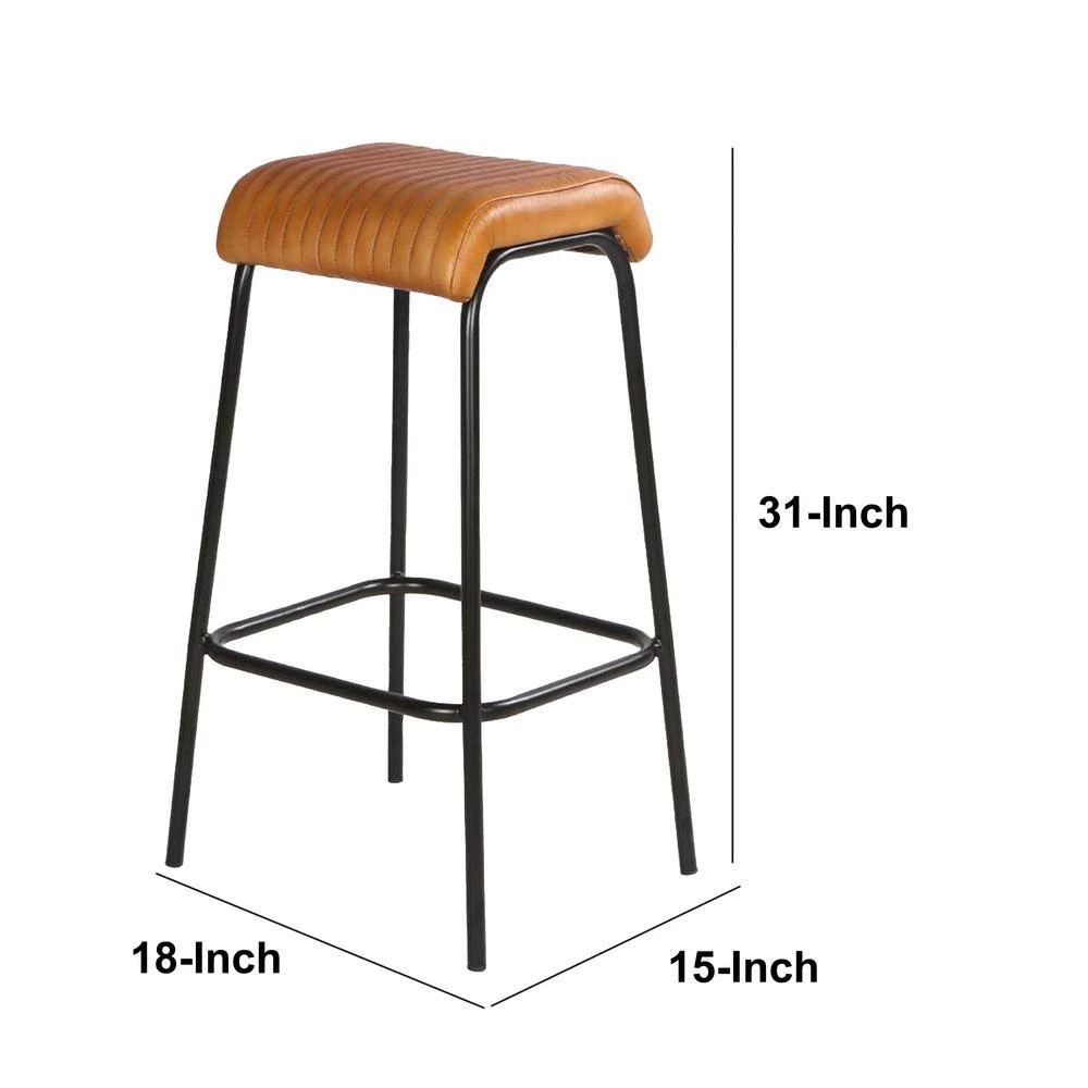 Comfort meets contemporary elegance with this expertly crafty barstool. Featuring a saddle-style seat with densely padded cushion and elegant channel-stitched details, it is handcrafted from a lightweight yet sturdy iron frame in black finish. Upholstered in tan brown genuine leather, this barstool perfectly fits your bar height table or bar countertop. It is bolstered with stretchers that double as footrests for additional comfort. This barstool harmonizes with a wide variety of decor styles, whether industrial, modern, transitional, or Scandivanian.