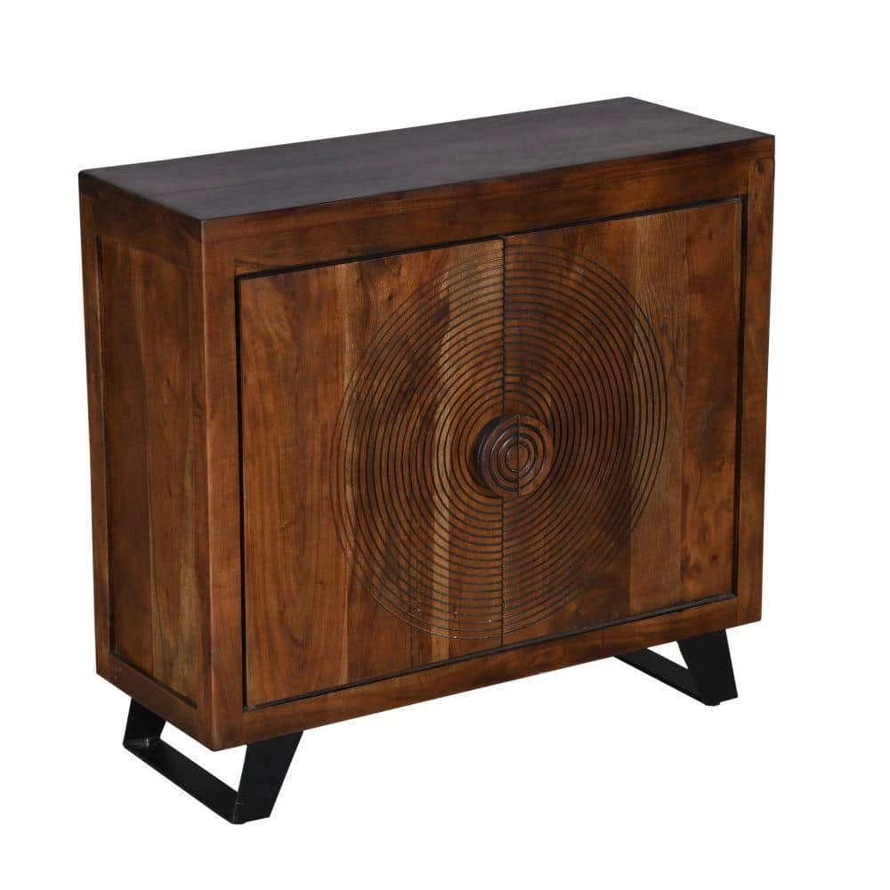 A sterling example of quality craftsmanship, this accent storage cabinet displays cleanly engraved lines for aesthetic appeal and features two doors which open to reveal a spacious storage shelf. The frame is supported on an angled metal base and the piece is made from a combination of acacia wood and composite wood in a rich walnut brown finish. The aesthetically visible grain details impart an enchanting vibe to this piece of furniture.