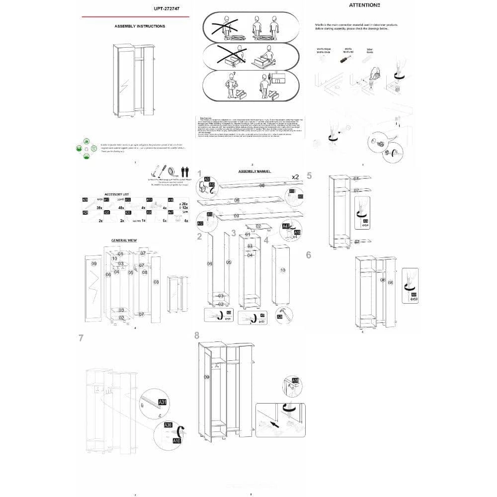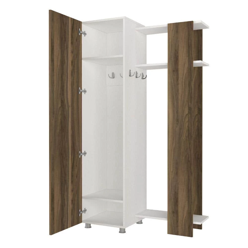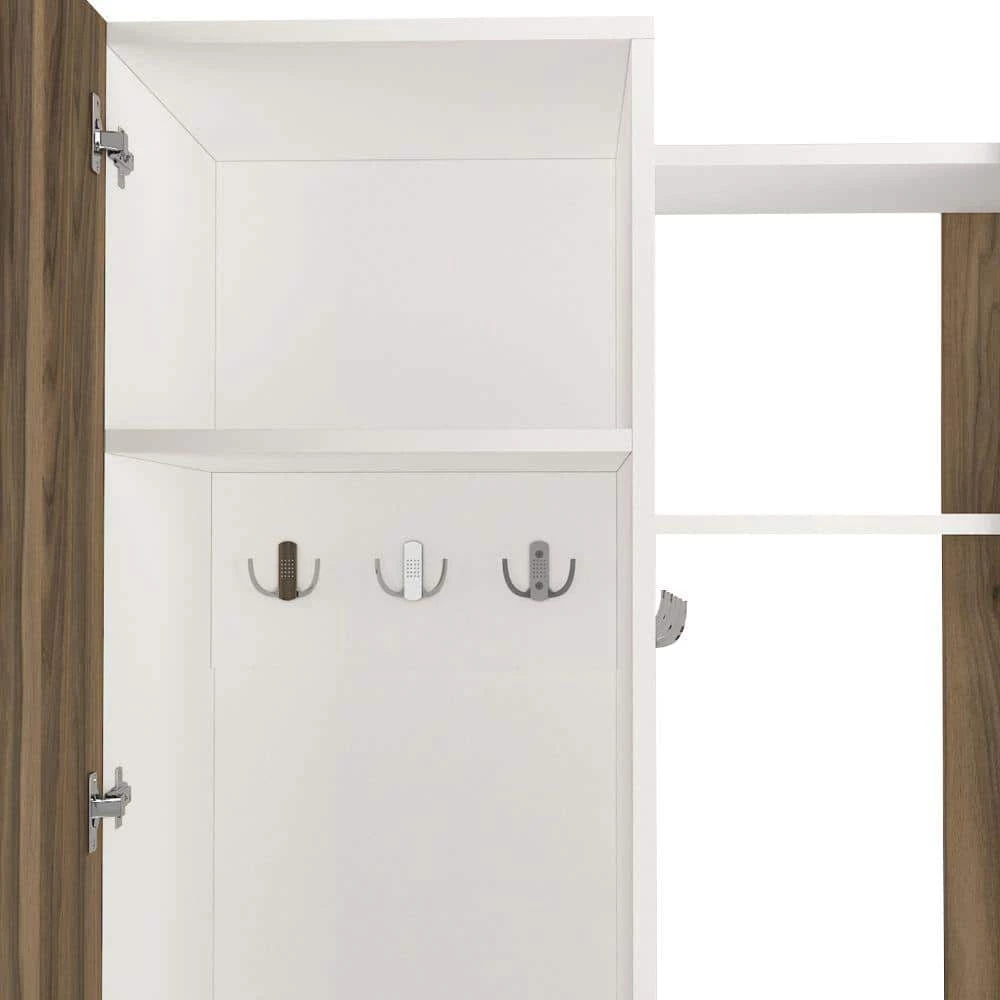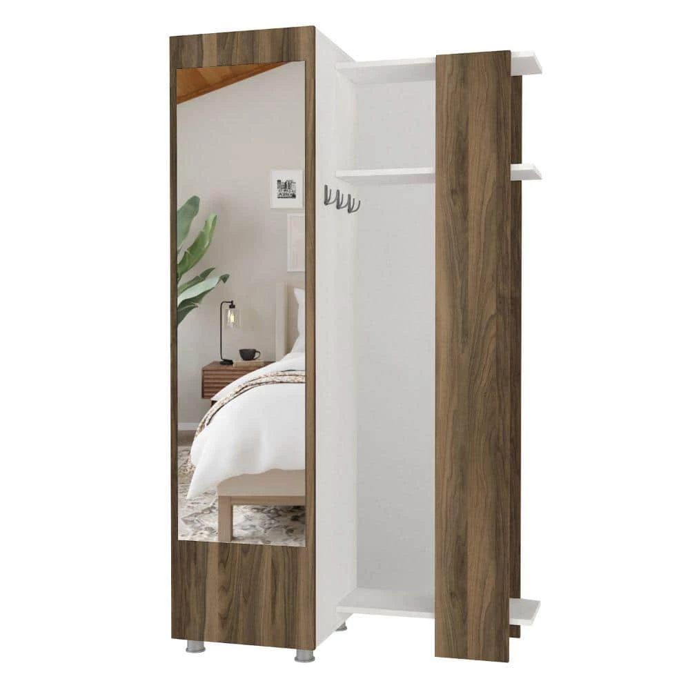 Make your morning routine an absolute breeze with this sophisticated and convenient standing wooden closet cabinet with metal frame, mirror, hooks and shelves for your clothing and accessories, easily placed in whatever room is most convenient for you. Amazingly, the piece also comes with a mirrored door panel for getting ready, doing a self care routine, or for last minute touch ups before you walk out the door. Depicting a sleek, modern, geometric design, this piece offers plenty of storage space, with two shelves and multiple hooks. The mirrored door opens to reveal two additional inner shelves. Handcrafted from durable, sustainable, high quality particle board, it is coated with melamine. The replicated wood grain details add a natural flair to its modern aesthetic, while the glossy white and natural brown finish allows this piece to stand out and harmonize with a variety of decor styles. With round metal legs and a strong panel wood base for effortless stability, this piece can be placed in your foyer, hallway, walk in closet, or bedroom.