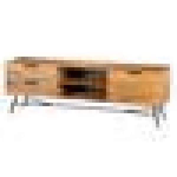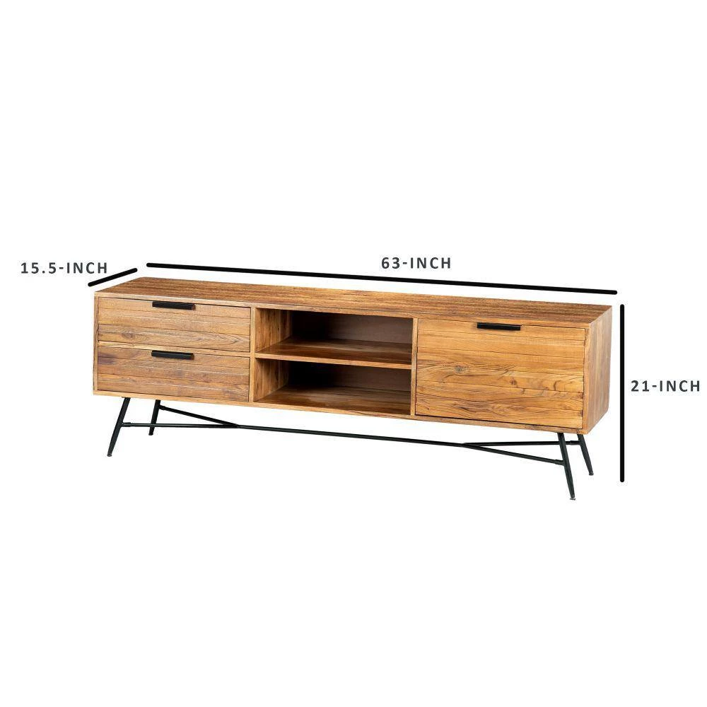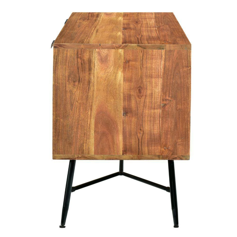 Add spacious storage to your entertainment area with the inclusion of this media console, supported on a black finish metal base with stretcher. The sophisticated furniture piece is constructed using brown finish acacia wood with aesthetically visible wood grain details. It features 2-drawers with fingertip metal handles, 2-open shelves and a cabinet that provides an organized storage to your DVDs, media players and other accessories. Due to the handcrafted nature of the product, there may be variation in color, finish, wood grain and knots.