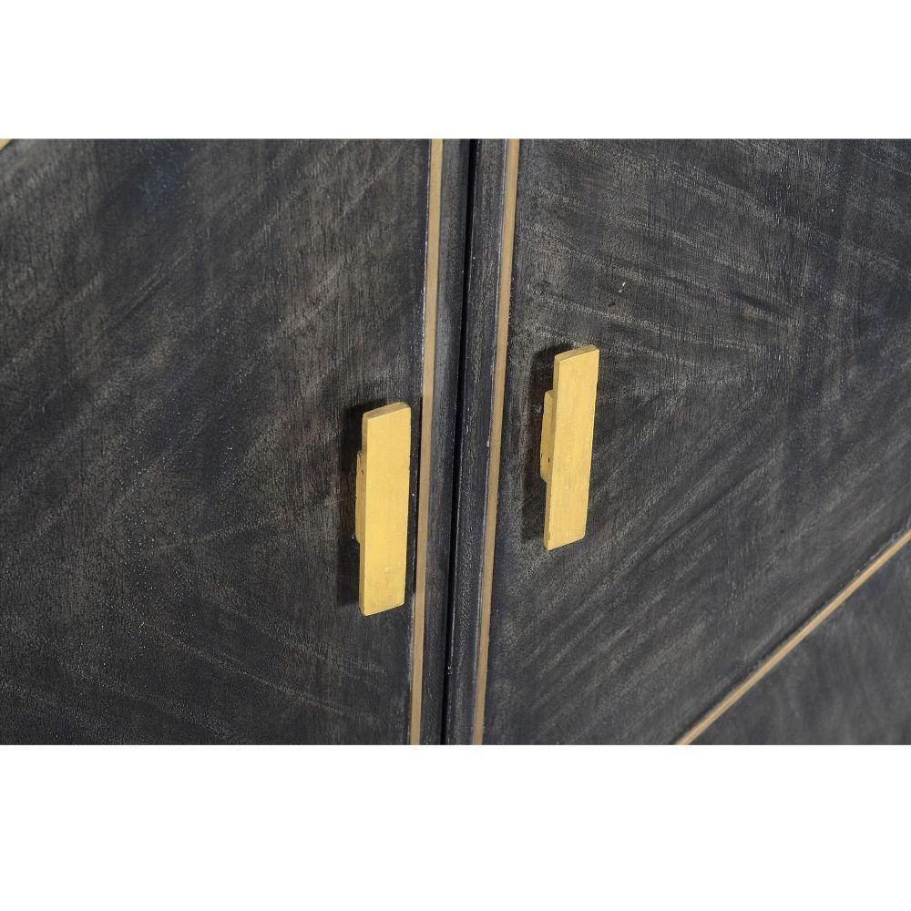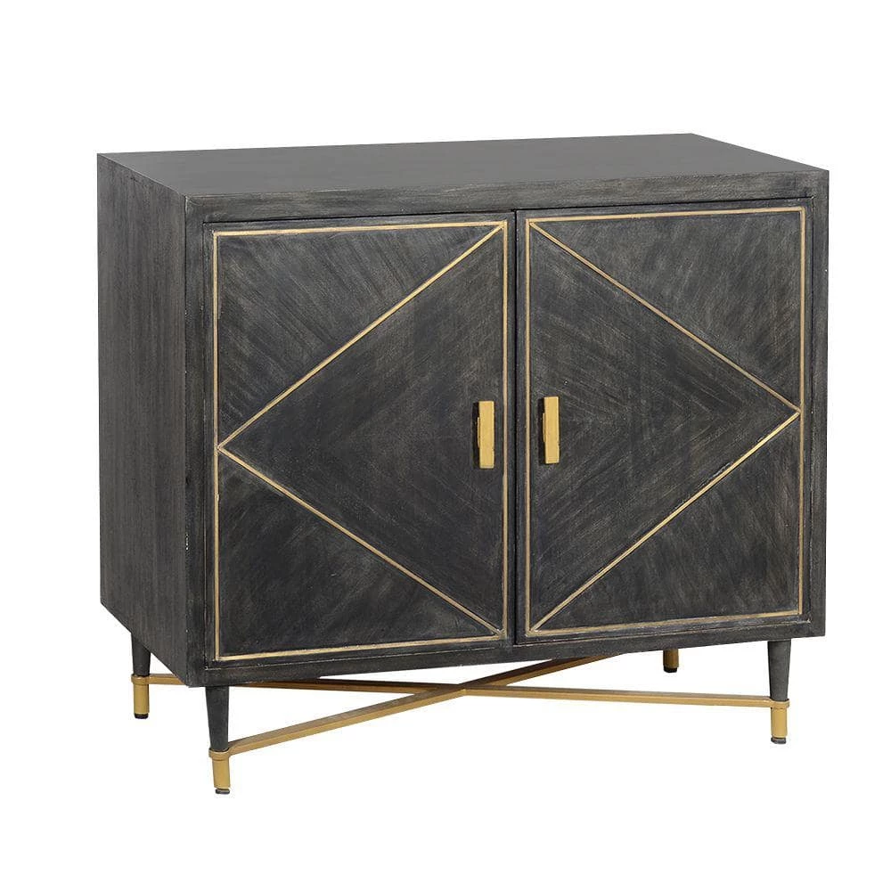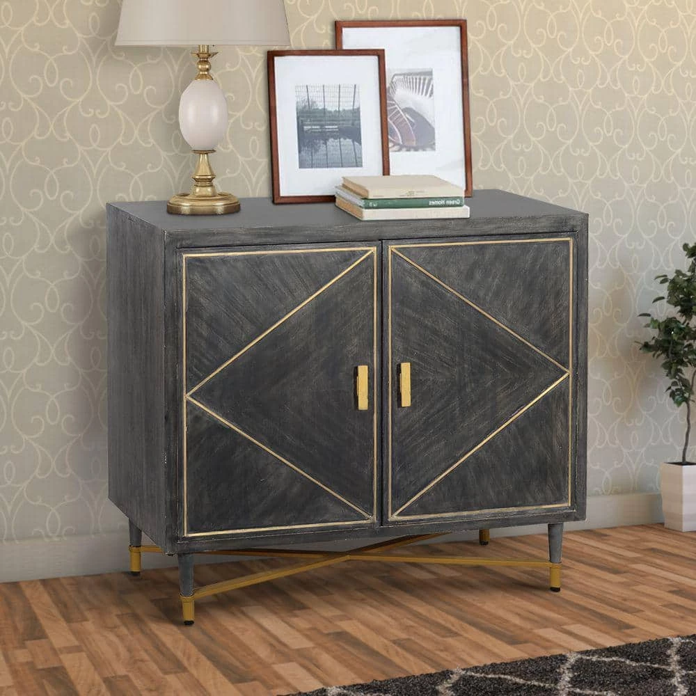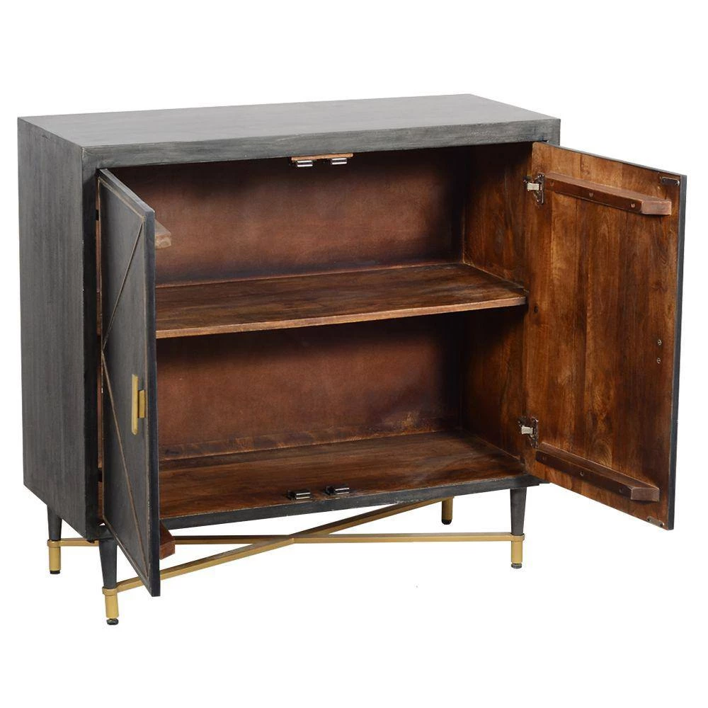 Modify your space with the addition of this mango wood constructed cabinet, offering ample storage. Handcrafted in a distressed gray finish, this cabinet features double door storage with 2 interior shelves that offer spacious storage while antique gold metal handles offer easy accessibility. Supported on X shape metal base with tapered legs support, featuring floor levelers that offer stability on uneven floor. The door fronts accented with diamond pattern brass inlays to give it an edge of style. Due to the handcrafted nature of the product, there may be variations in color, finish, wood grain and knots.